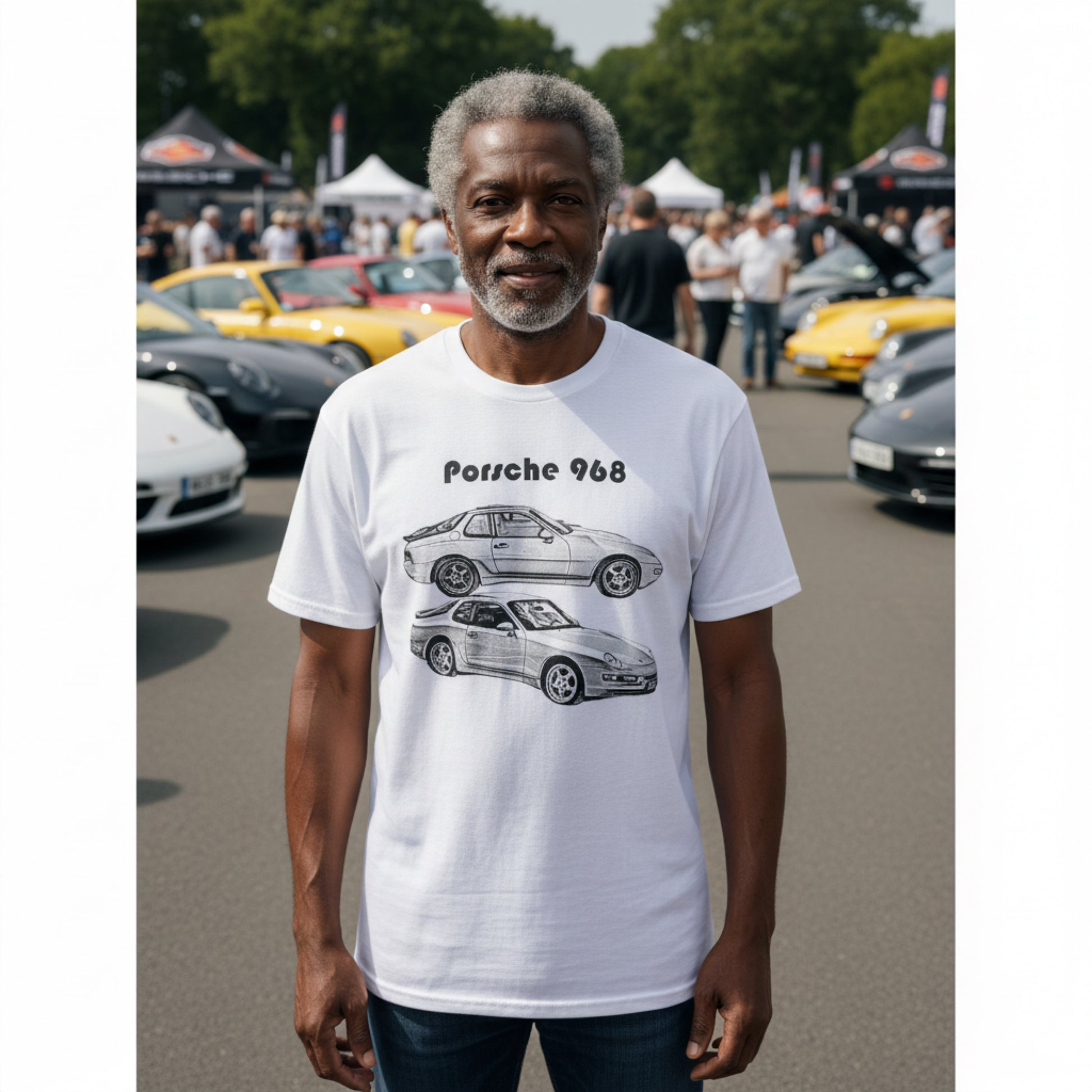 Collarless t-shirt with round neckline and cotton material. Suitable for comfort and casual wear. The text "Porsche 968".